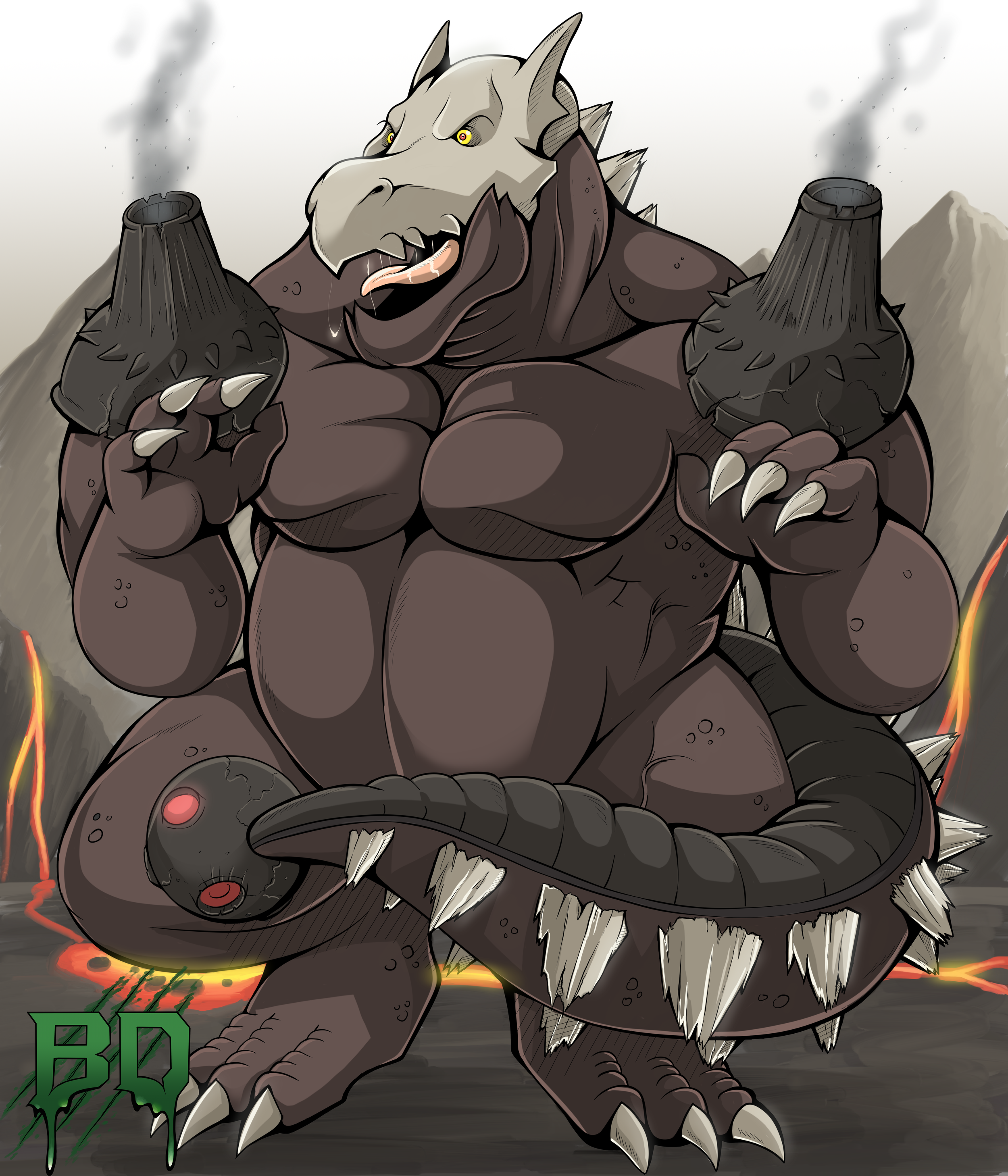 This will be my second original kaiju design, and I'm going to name him 'Volcalarius.' He's a giant monster that was created from a volcanic eruption. He has two volcanoes on his shoulders that spews magma and toxic ash. The tip of his tail is a boulder-like hammer that shoots flame from four sides. His Japanese name would be: 火山岩獣ボルカラリウス (Kazangan-jū Borukarariusu).